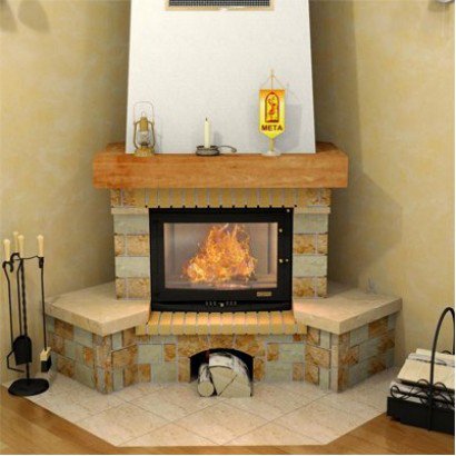 Предтопочная и надтопочная часть выложена шамотом песочно-жёлтого цвета. Каминная балка изготовленная из МДФ и покрытая шпоном дуба, послужит отличной полкой для каминных аксессуаров, таких как часы, канделябры, рамки с фотографиями и др.